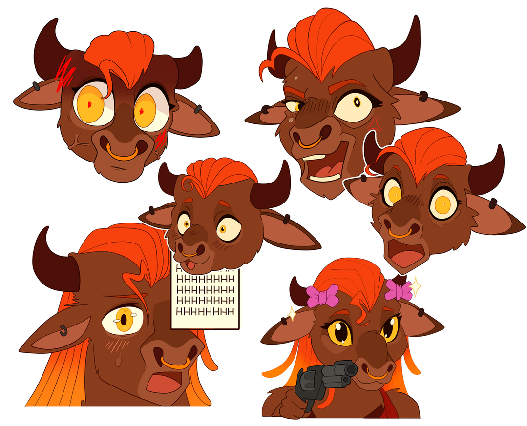 Illustration of the character front/back design with no rendering + 2 expressions headshots.